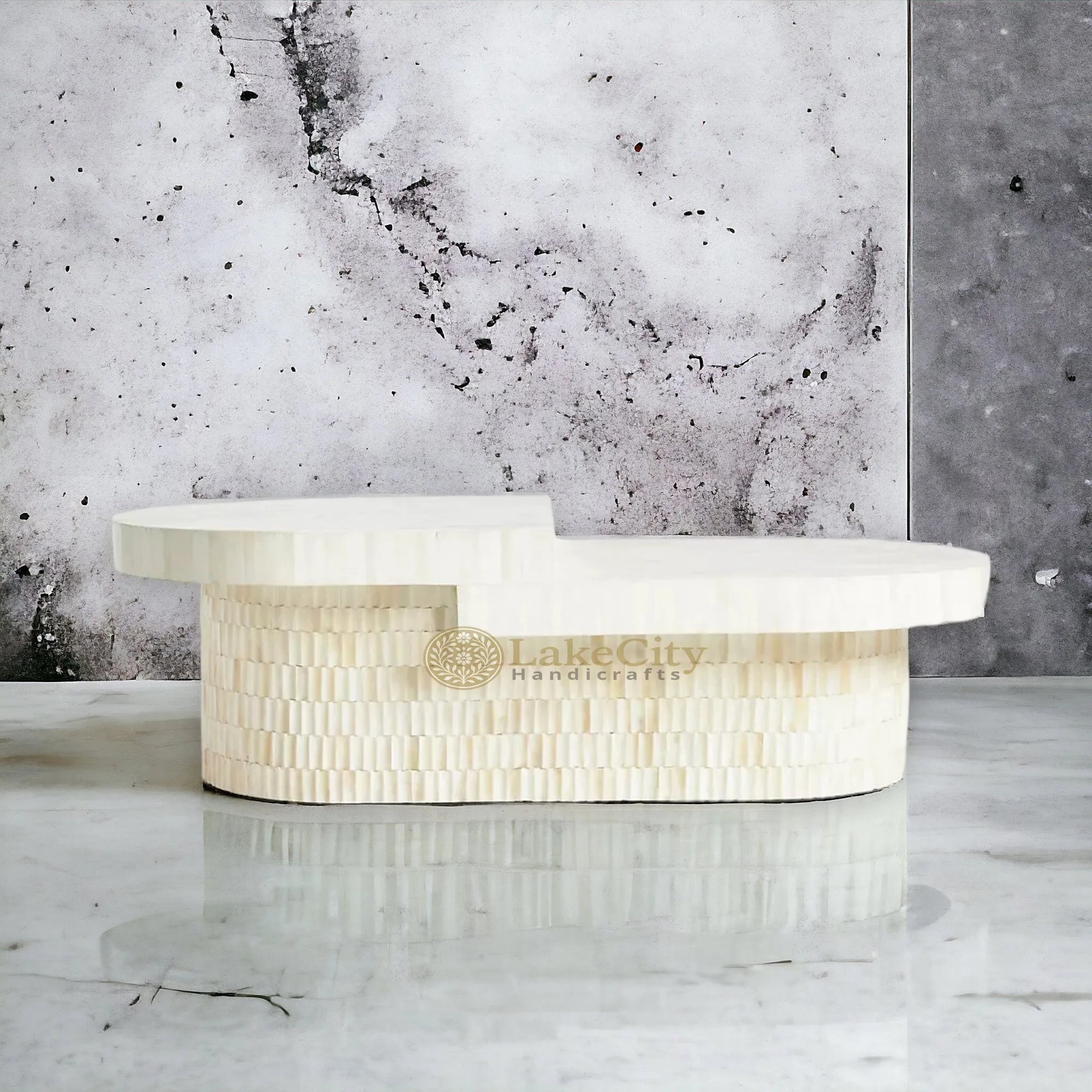 This room-anchoring coffee table boasts a dramatic bone overlay with a multi-height structure, perfect for displaying favourite books or offering spreads at a gathering.