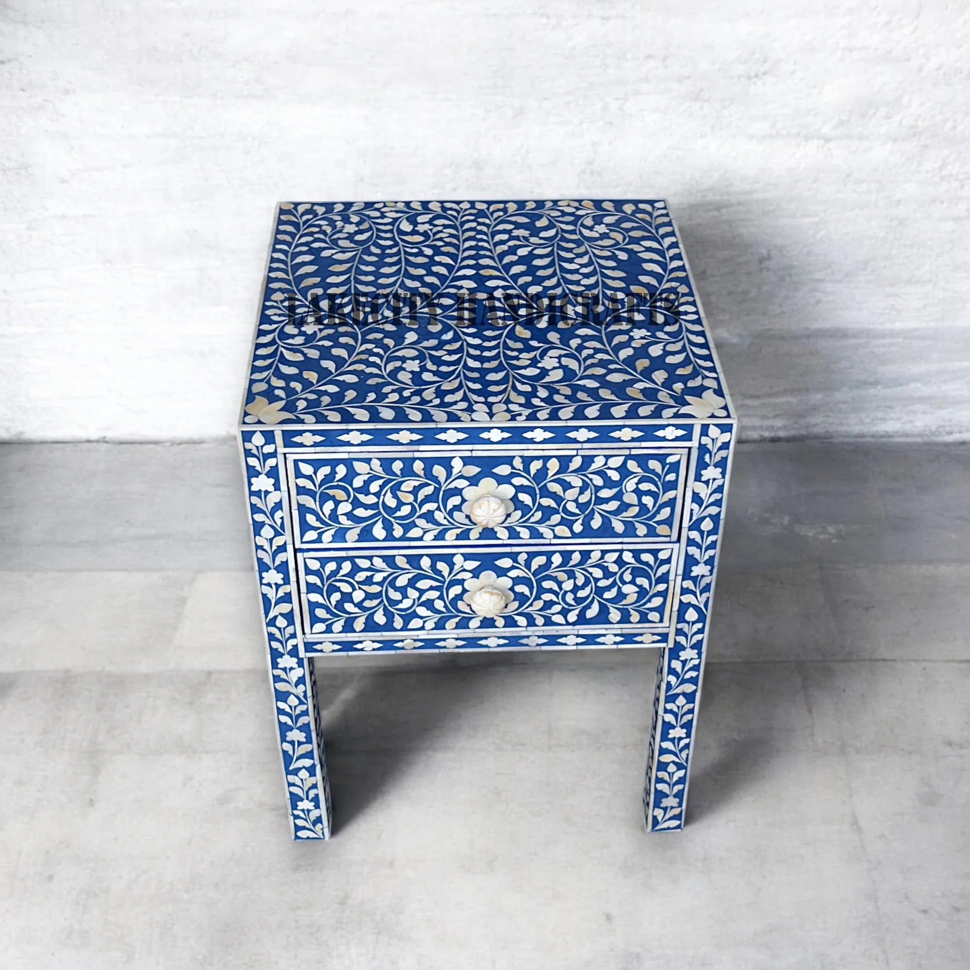 Bone Inlay is the timeless jewel in Indian Inlay Furniture. Luxurious and elegant, these Bedside Tables are the perfect pieces to add that exotic spirit into your bedroom. This Bedside Table has an intricate floral detail as well as gorgeous carved bone handles.