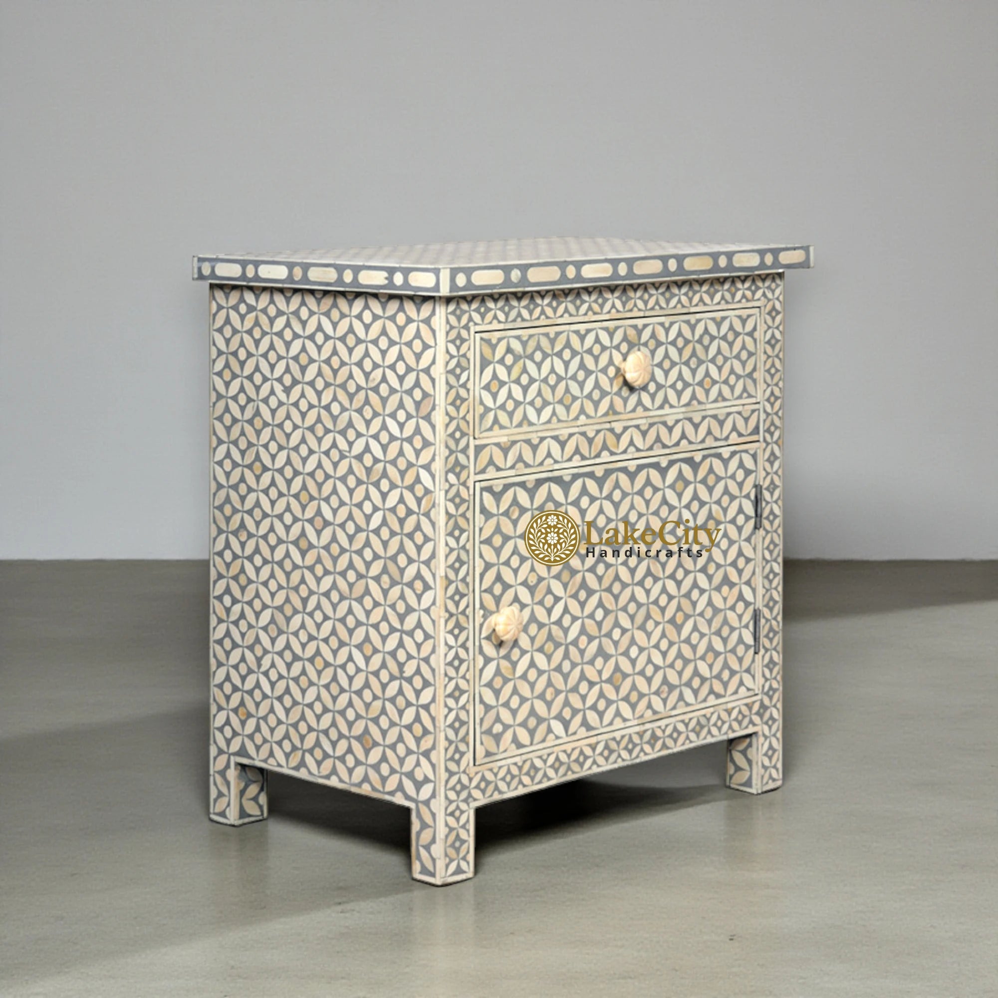 Exclusive to Lakecity Handicrafts our bone inlay Bedside will compliment existing bedroom furnishings and add that unique character to your peaceful space! Consisting of a slim top drawer and cupboard for ample bedside storage, It is lovingly created with the use of camel bone and grey resin to cleverly design whichever exquisite pattern you choose.