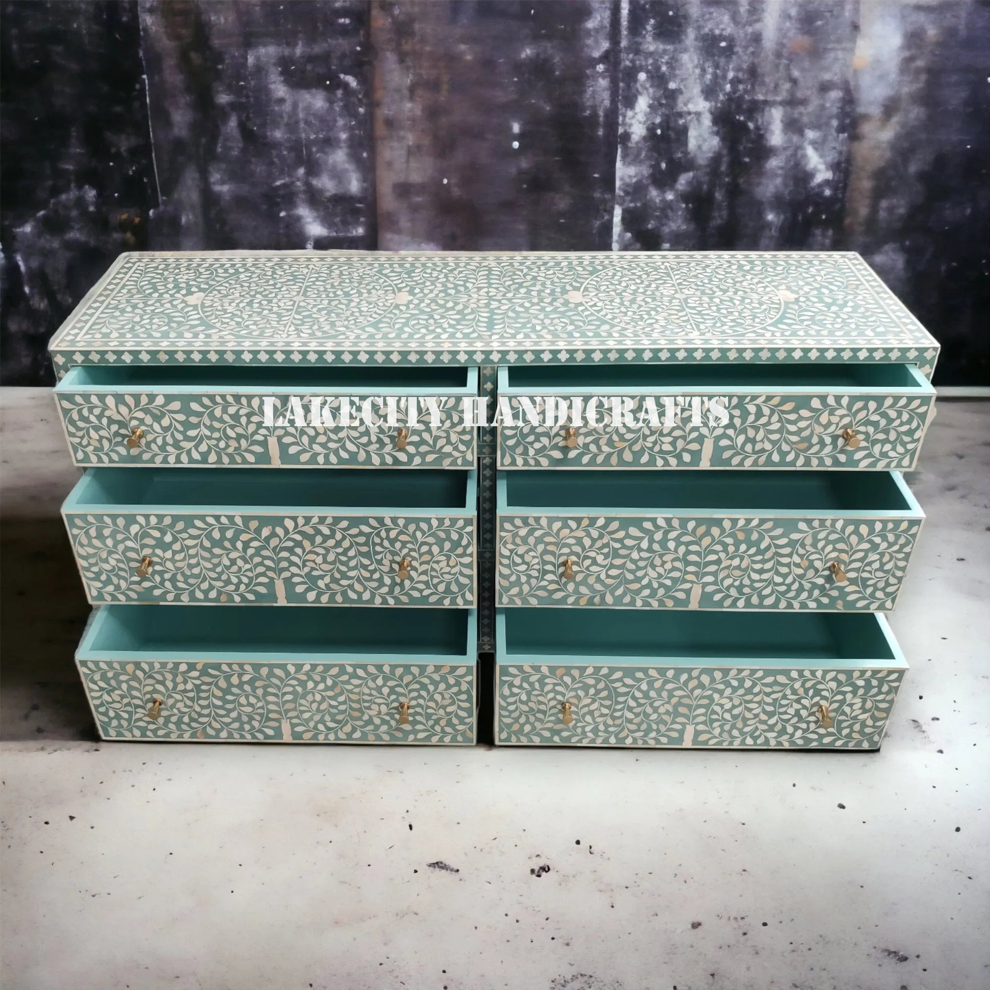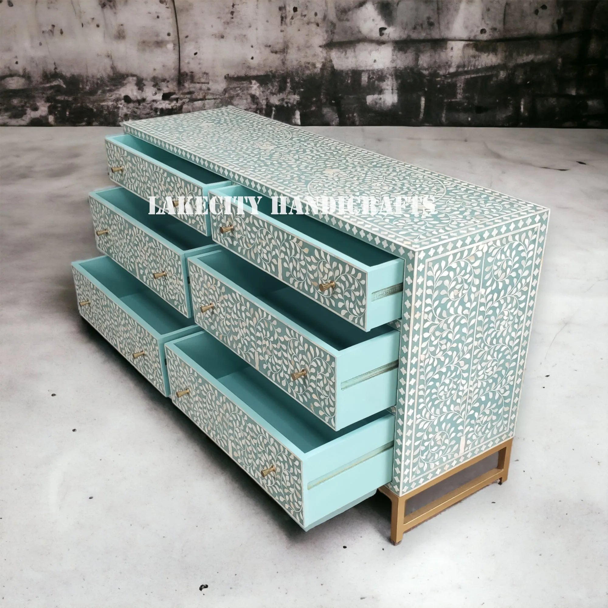 Roosted aloft the thin brass finish frame, wooden chest inlaid with pieces of bone in a spiral leaf pattern looks elegant. This Bone inlay 6 Drawers chest will compliment your interiors and provide you with ample storage place.