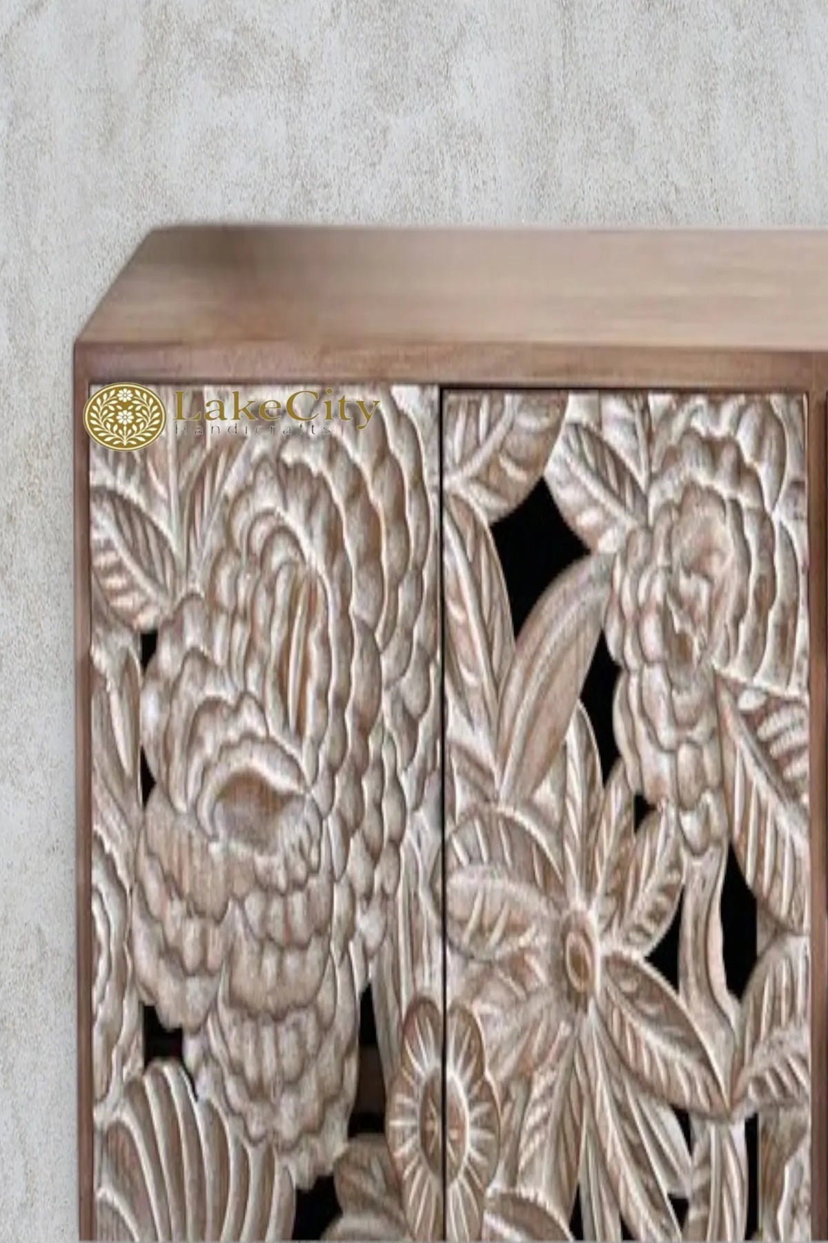 Hand-carved Large Roses 4 Door Sideboard Buffet Whitewashed