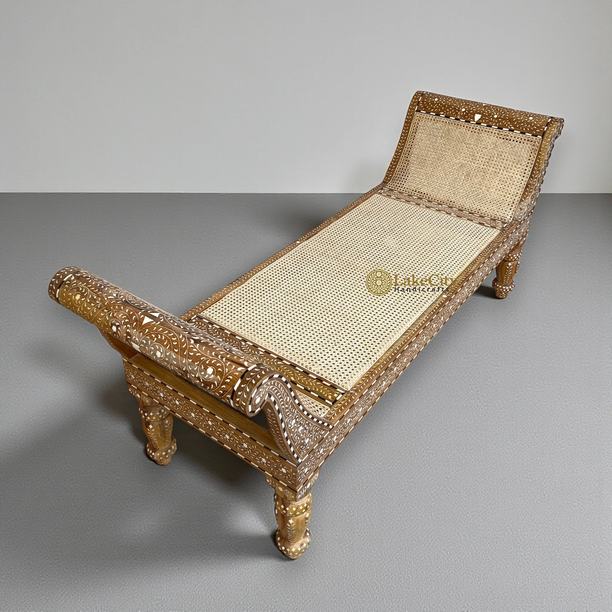 Made from aged Teak Wood and then bone inlaid onto the hand-carved design with fine precision this daybed with cane work is a pure art.