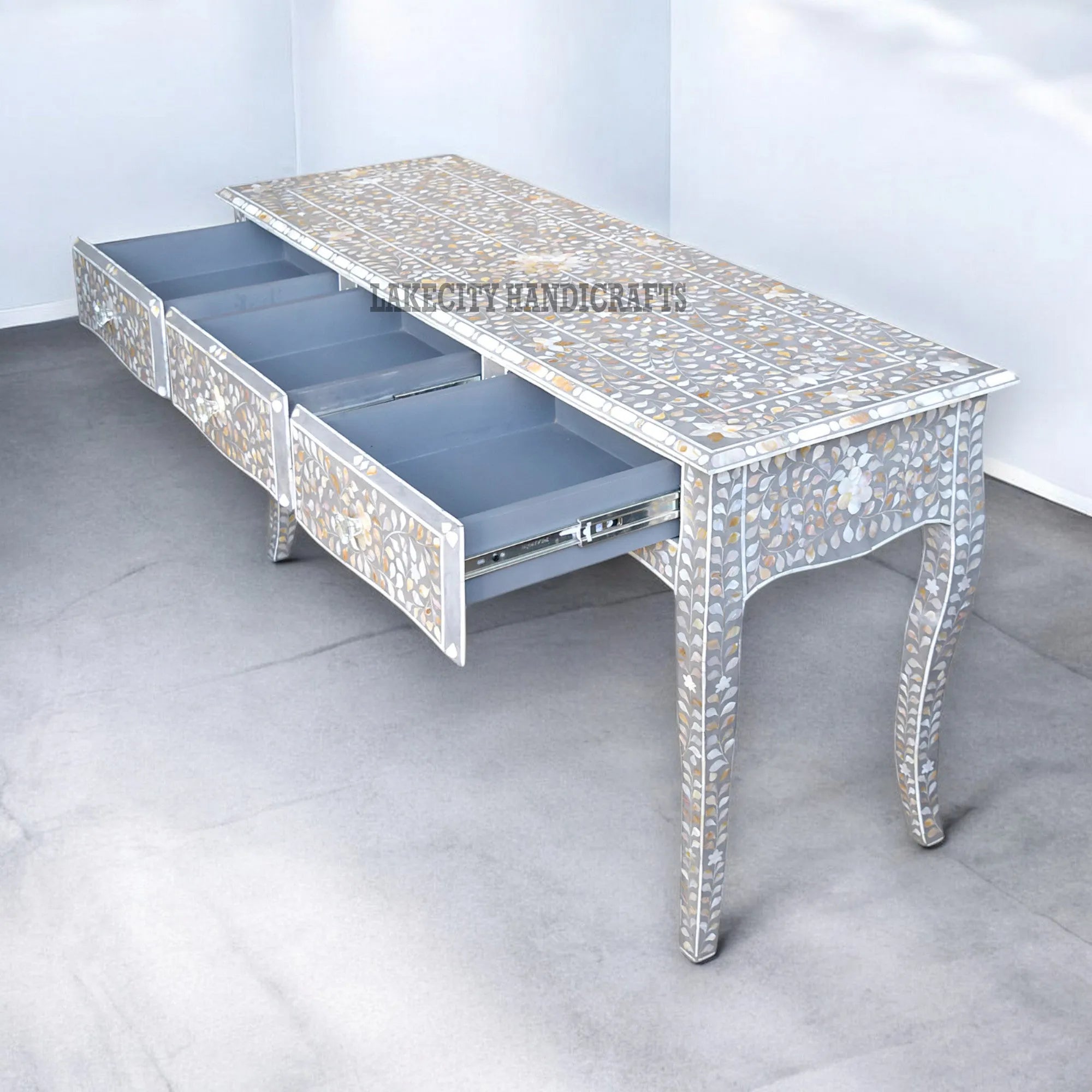 The craftsmanship of this mother-of-pearl inlay Dressing Table / Console / Desk is beautiful. Every piece of mother-of-pearl is hand cut and polished and set into the most stunning floral patterns to create a piece of furniture that will surely become an heirloom. Decor your house with this art, to turn heads twice.