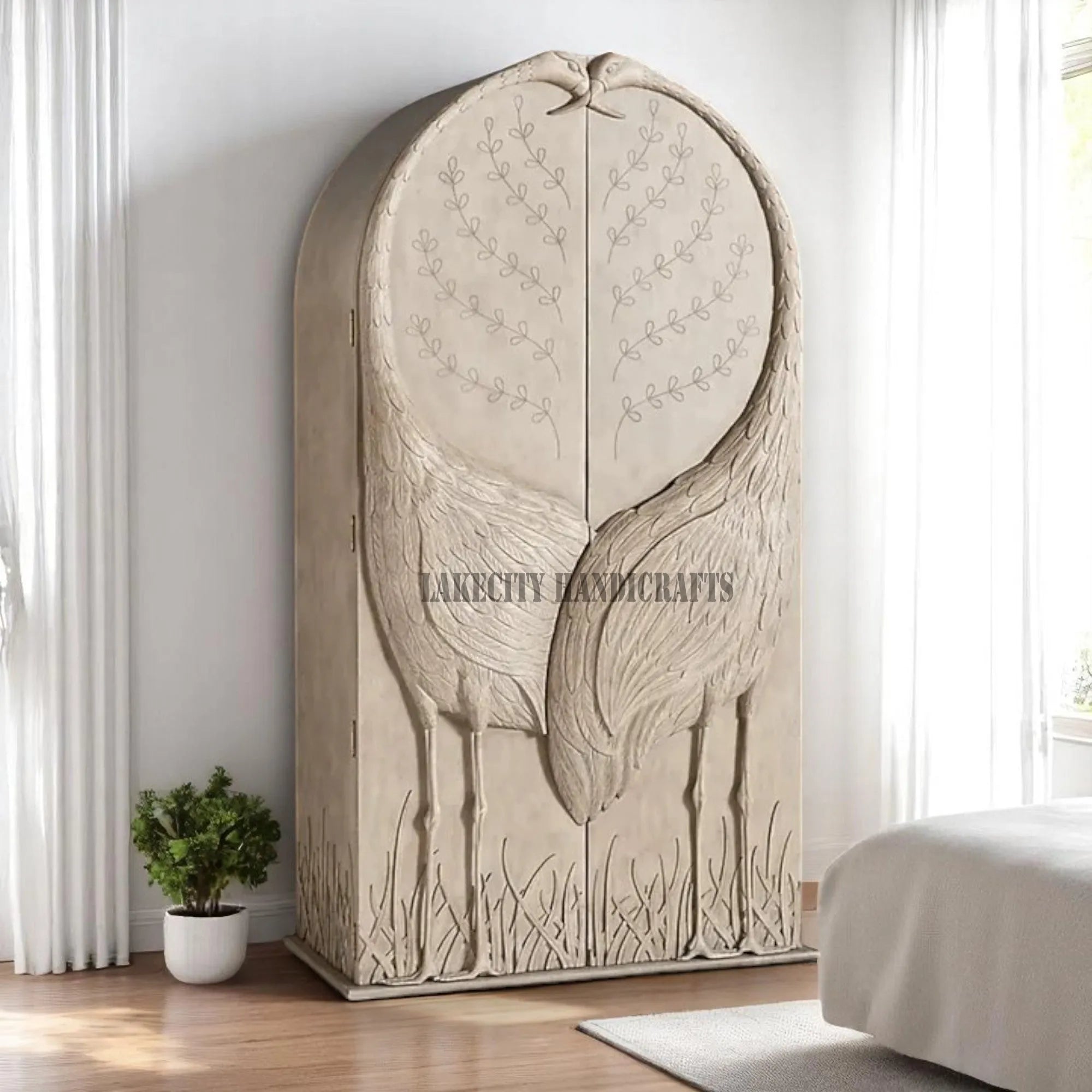 Our Wardrobe is Hand carved and made from solid wood, this elegant wardrobe is a true work of art. Its filigree-inspired cutouts create a lively shadow play when placed near a sunny window.