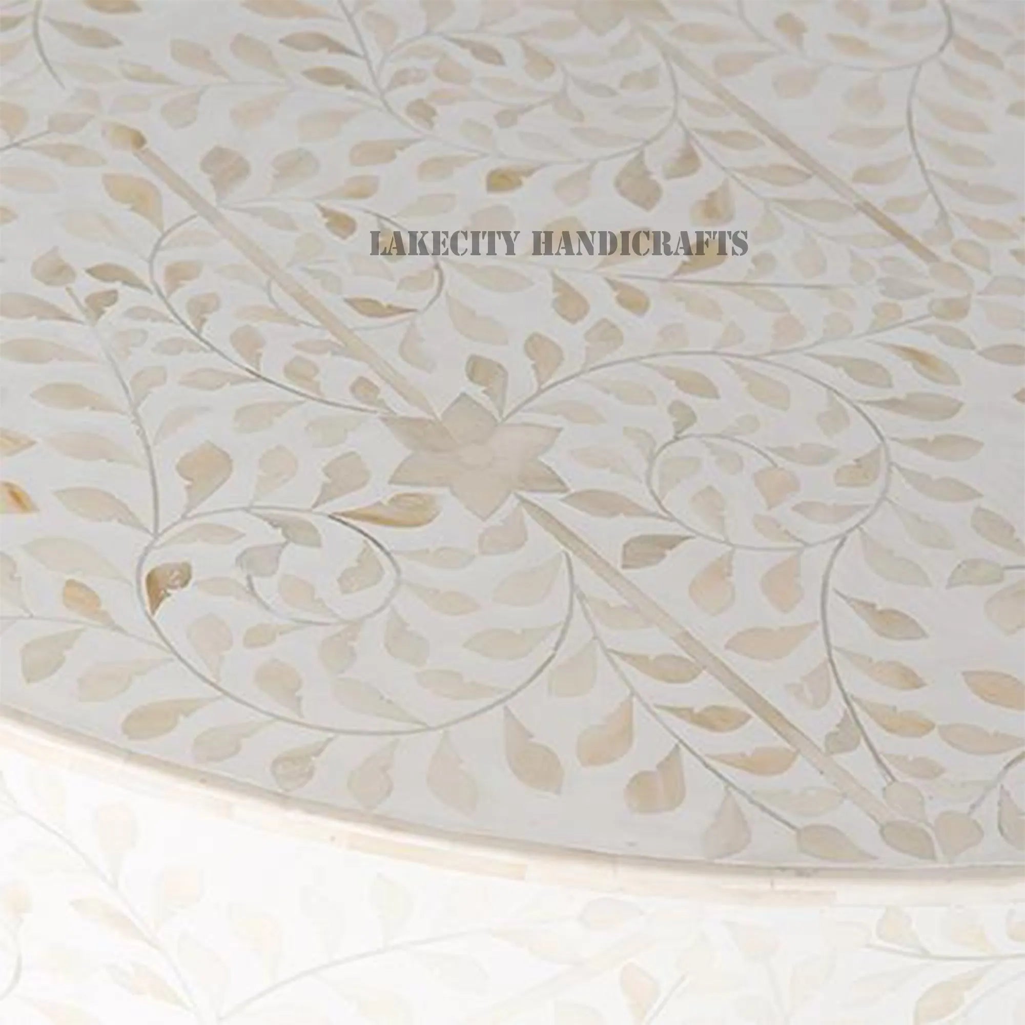 A White Bone Inlay Centre Table with Brass is a distinctive piece of furniture known for its intricate craftsmanship and elegant design. The inlay work involves embedding shaped pieces of camel bone into a base, typically made of wood or resin, to create elaborate patterns and motifs. This process is carried out by skilled artisans, often from regions such as Rajasthan, India, where bone inlay has been a traditional craft for centuries.