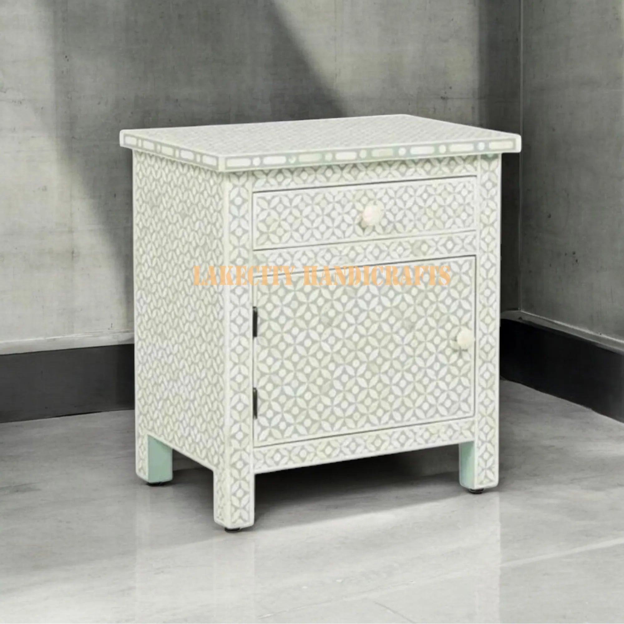 Exclusive to Lakecity Handicrafts our bone inlay Bedside will compliment existing bedroom furnishings and add that unique character to your peaceful space! Consisting of a slim top drawer and cupboard for ample bedside storage, It is lovingly created with the use of bone inlay tiles and resin to cleverly design whichever exquisite pattern you choose.