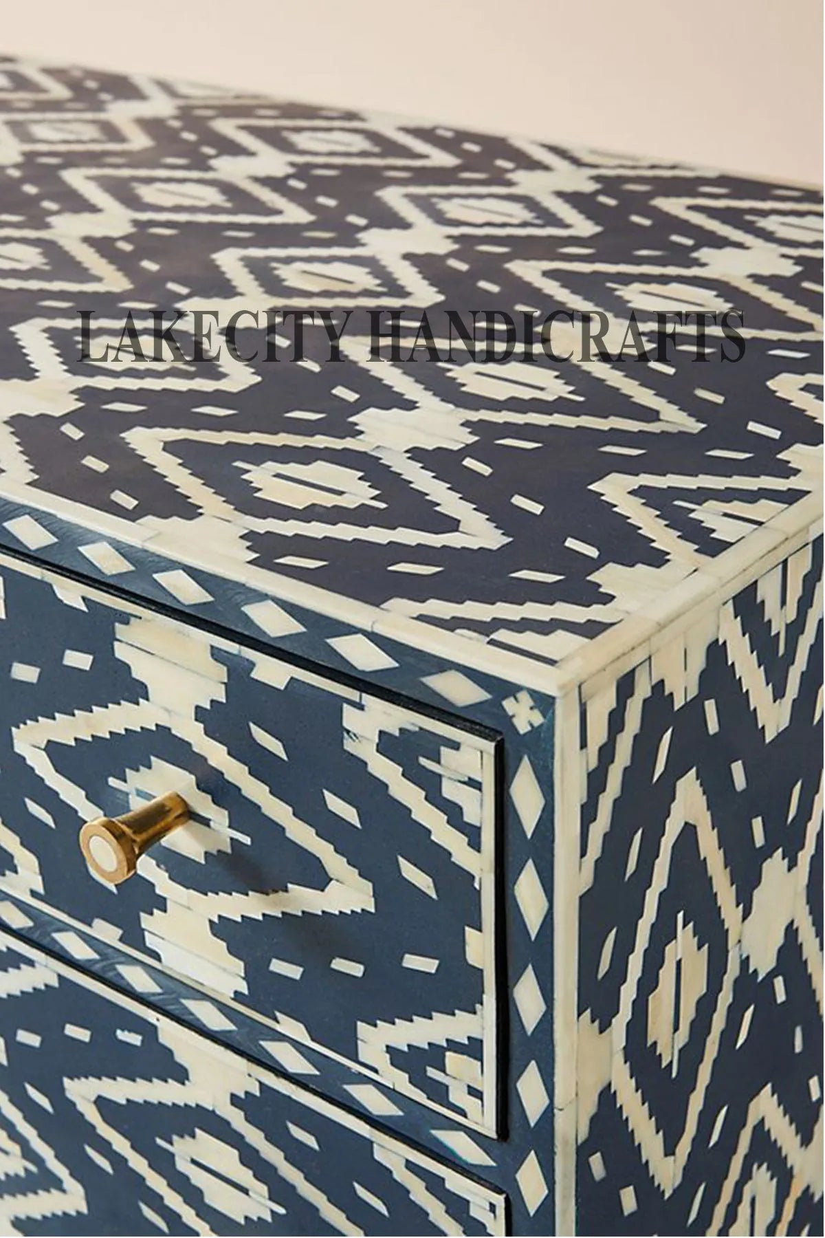 Ikat is a dyeing technique used to create a distinct style of textile patterns using fabric. The same patterns are made on the furniture using the Bone inlay method. Handcrafted bone Inlay cabinet featuring stroked brass hardware. Roosted aloft the thin brass frame, wooden cabinet inlaid with pieces of bone in Ikat design pattern looks elegant.